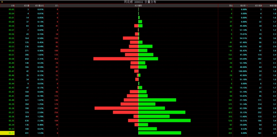 价量分布:提供每个成交金额及该金额对应的成交数量。该功能在盘口分析的时候特别重要,可以结合筹码指标一起使用。在个股分时走势页面里按“F2”或“02+enter”,都可以切换到加量分布表。分价表可以直观地显示当日的成交分布状态。