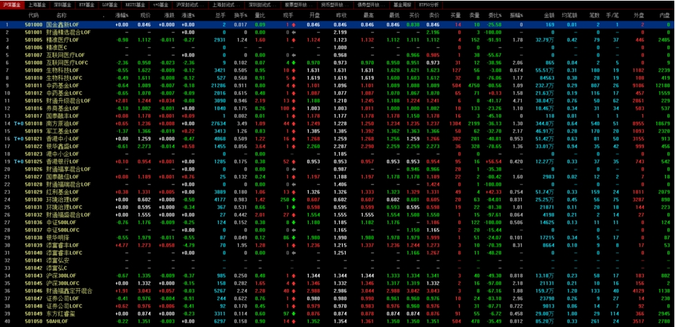 “扩展行情”菜单中的“基金”:您可以在这里方便的查看沪深开放式和封闭式基金、LOF基金、债券基金、货币基金等的报价表,以及基金周报、ETF50分析等数据。