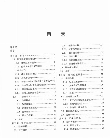 iOS增强现实应用开发实战系统讲解增强现实的实用工具、核心技术和基本原理,以及如何将增强现实技术与iOS开发技术相融合。图文并茂、实例丰富,以简明易懂的语言循序渐进地讲解了游戏、社交和面部识别等各种类型的iOS应用的开发方法,可操作性强。更为重要的是,它还讲解了如何将增强现实技术应用到已有的应用中!全书共分13章,具体内容如下:第1章主要介绍创建增强现实应用的准备工作以及关键章节的简述;第2章介绍检查各种硬件组件可用性的方法;第3章介绍iOS的地图功能和将其集成到具体应用的高级技术;第4章介绍加速计和陀螺仪、磁力计等iOS传感器;第5章介绍如何在一个增强现实应用中播放和记录声音;第6章,介绍如何使用iPhone或者iPad的拍照和录像功能进行视频采集;第7章讲解如何使用cocos2D在摄像头视图上覆盖一个HUD层;第8章细述一个cocos2D增强现实应用的创建;第9章介绍String、Qualcomm和ARKit增强现实工具包的应用;第10章讲述利用String、OpenGL ES建立一个基于标记的增强现实应用;第11章介绍如何建立一个社交型的增强现实应用;第12~13章介绍面部识别技术及其在增强现实应用中的用法。