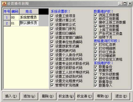 执行“系统设置” →“系统管理员任务” →“设置操作员、分配操作权限”,出现如下窗口: