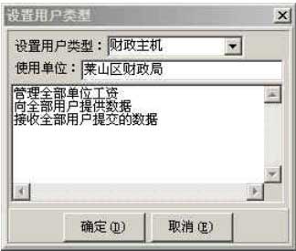 用户类型的可选项取决于系统运行方式,在财政集中处理方式下,有“财政主机”和“代发工资银行”两种选择,在分布式处理方式下,有“财政主机”、“财政分机”、“主管部门”、“基层单位”、“代发工资银行”五种选择。