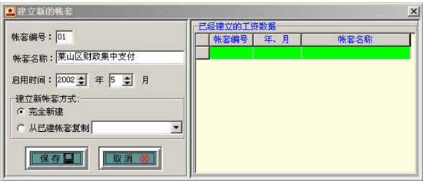 建立新帐套的方式:有两种选择,完全新建和从已建帐套复制,选择前者,工资项目、部门序列、计算公式、审核公式、人员工资等全部为空,需逐项设置或输入。选择后者,将某已建帐套复制成新的帐套。