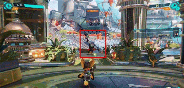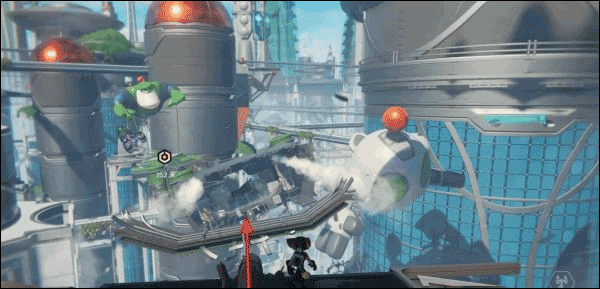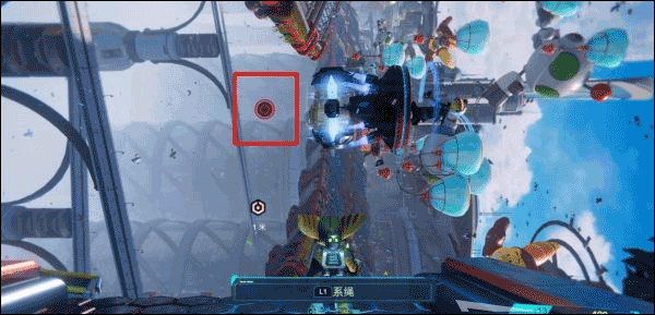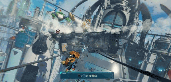 正在乘坐移动平台前方第三个场地时突然遭遇袭击,瑞奇被炸飞到滑行轨道上,按×键跳起躲避障碍物。