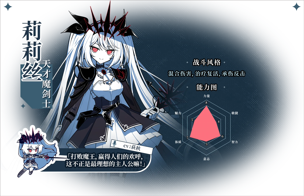 银葱之森的神秘美少女,是一位略懂些魔法技艺的剑士,自称要打败魔王赢得众人的欢呼——不过目前的当务之急是抢购打折面包。