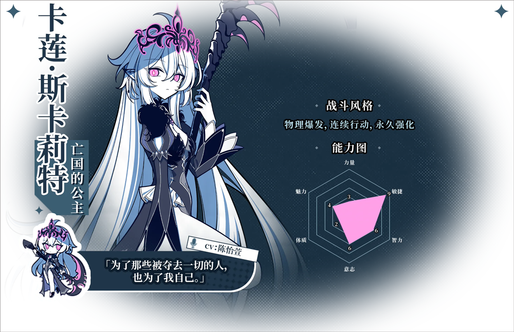 每一位角色都拥有6个维度的数值,以及其独一无二的技能模组及分支。你可以影响每一位角色的成长路径和装备,最终率领一支极具个人风格的精英冒险者小队。