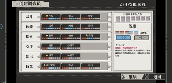 3、带星号的为职业专属技能,最高可升至80级;无星号的为兴趣类技能,上限为60级。建议将斗殴点满至80,射击、运动和闪避均点到60。聆听与侦查作用有限,可视情况选择是否加点。