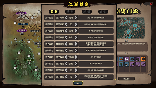 游戏伊始,玩家可以选择一个地点开创门派,不同地点所能产出的资源各有不同。除此之外,玩家还可以通过一定点数来定义独属自己的开局。