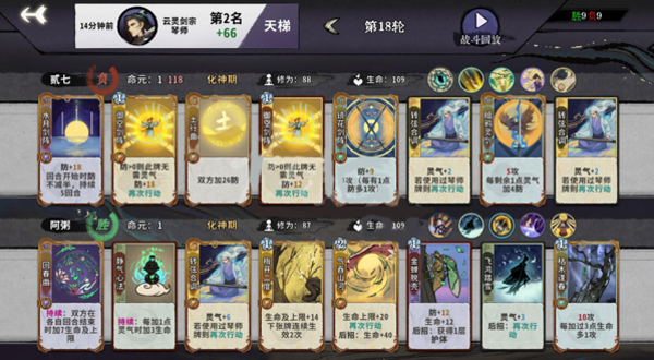 2、土行和暗鸦都可以针对性替换牌,如果对面天胡云剑成长高于你的防御成长,可以把御空全都换成转弦。如果是转弦都2级的情况下,攒爆发可以把镜花前置2号位,水月6,暗鸦8,这样第4轮的13回合可以打出灵气4*2*3=24*4(暗鸦)=96防御+18+9=123 这还是对方前面把我们防御全都消耗掉的情况下。