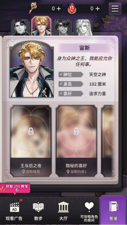 另外,神域之恋游戏还提供了多位性格各异的神明角色,包括内敛深沉的冥王哈迪斯、魅力非凡的众神之王宙斯、开朗随性的海神波塞冬以及优雅魅惑的爱神阿芙罗狄忒,玩家扮演的女主角色需要去与不同的男主邂逅,与它们触发各种不同剧情,培养彼此之间的感情,在这里体验恋爱带来的甜蜜。