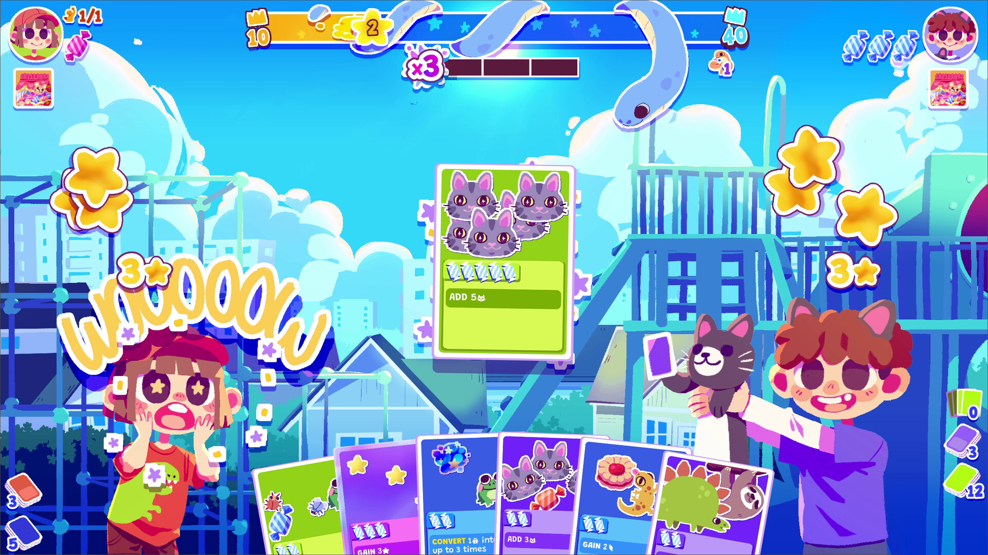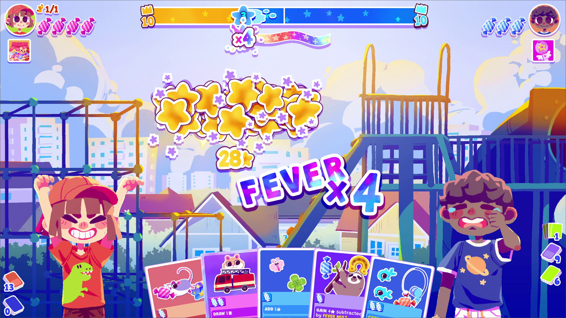 每张贴纸都有自己的效果,让你可以发挥无限的创意和策略!不过要小心,如果贴纸太多,卡牌的消耗就会过高,导致无法出牌。