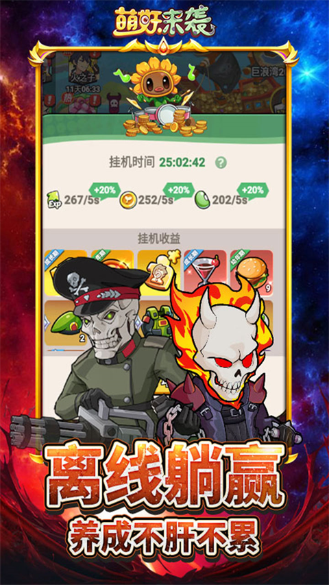 萌妖来袭是一款高策略性的放置卡牌手游。在这里,你将化身小镇指挥官,通过收集各具特色的植物萌妖,排兵布阵,构建最强阵容,以抵抗僵尸进攻,保护植物小镇,还可以将英雄改造进化,变得更加强大。另外,萌妖来袭游戏还有完善的挂机系统,在这里玩家可以享受到轻松挂机的游戏体验,不需要手动操作,一键自动战斗,超多道具都能通过挂机战斗获得,休闲不肝,还有多种副本等待玩家发现。