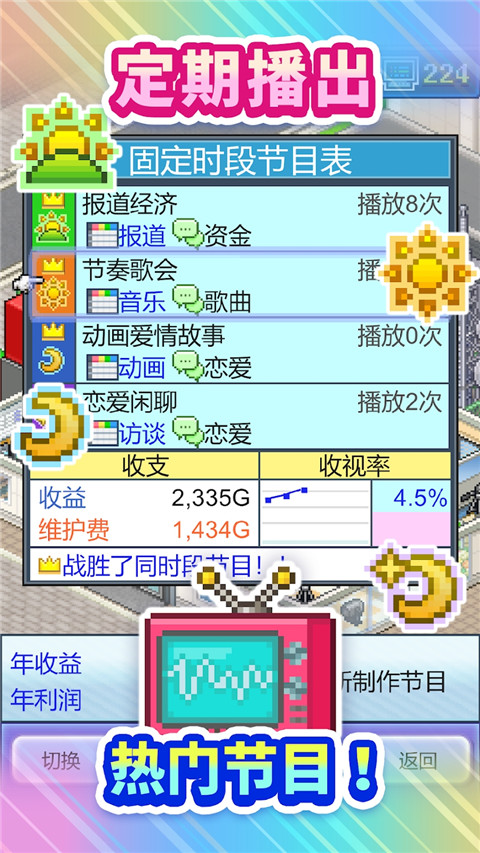 开拍电视制作物语中文版依旧采用开罗经典的像素风格和轻松的模拟经营玩法,支持虚拟按键和直接点击的两种操作方式,是模拟经营类游戏爱好者不容错过的佳作,喜欢的朋友们欢迎前来本站免费下载!