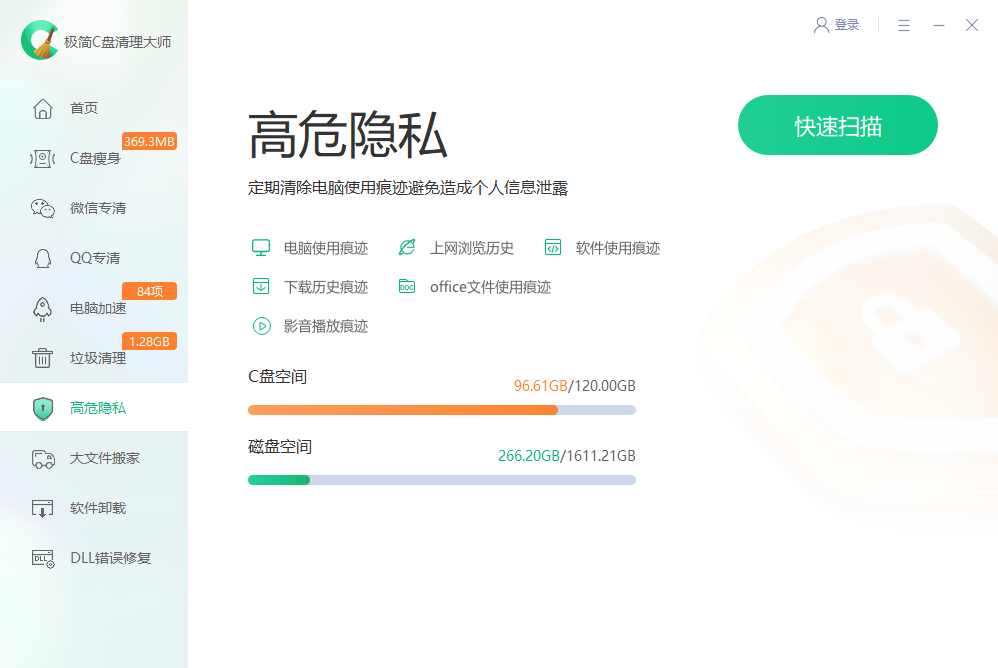 专注C盘深度清理,支持系统盘虚拟内存、补丁备份等专项扫描。