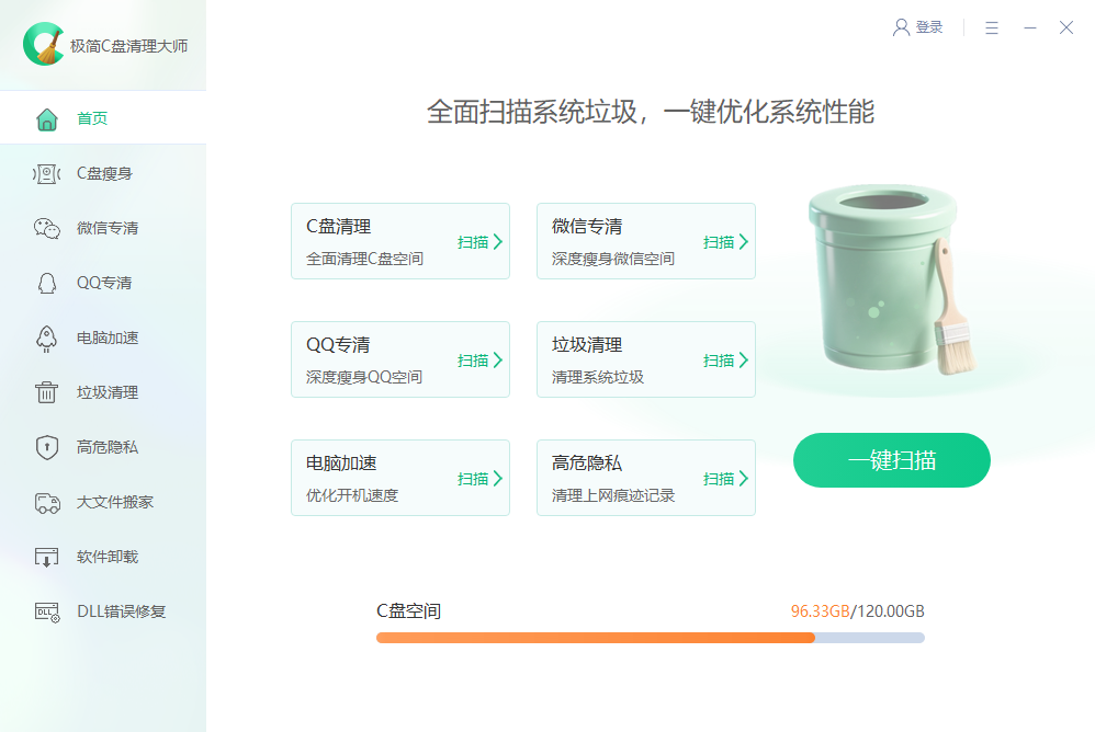 首页提供便捷的清理入口,可以点击右侧的一键扫描按钮直接扫描全盘文件。
