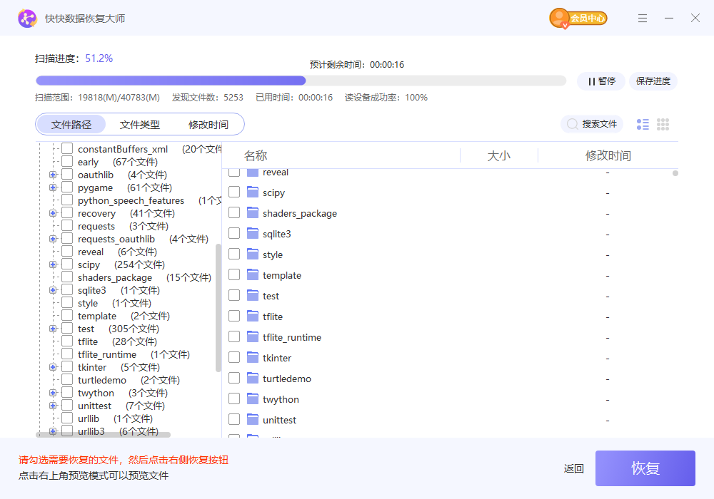 完成解析后开始扫描磁盘内容,由于分区容量及文件格式的不同,扫描文件可能需要几十秒钟,若分区有物理坏道,则需要的时间更长,请耐心等候。扫描过程中可以点击“暂停扫描”来暂停扫描过程,若已经扫描出丢失的文件,则可选中文件并点击恢复,若未找到,可点击“继续扫描”按钮。点击“保存进度”按钮可以保存目前已扫描出的文件进度,已保存的进度可在上一页的“加载扫描进度”里找到。