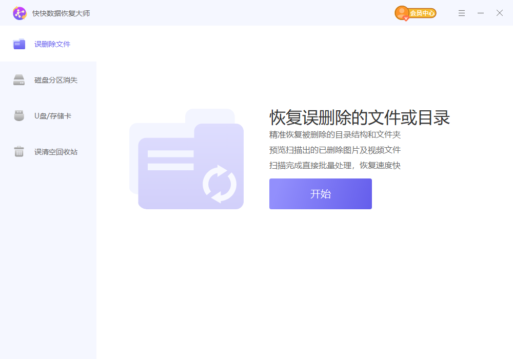 用户打开软件,自动定位到误删除文件页面,点击开始即可自动扫描计算机所有磁盘内容。
