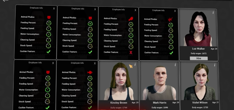 顾客们性格各异,并非总会接受你的建议。你可以亲自处理每一笔交易,也可以雇佣员工来打理日常事务,如收银、照料动物、清洁和搬运货物。每位员工都有其优点与缺点,让你可以自动化日常琐事,更专注于店铺的宏观发展。
