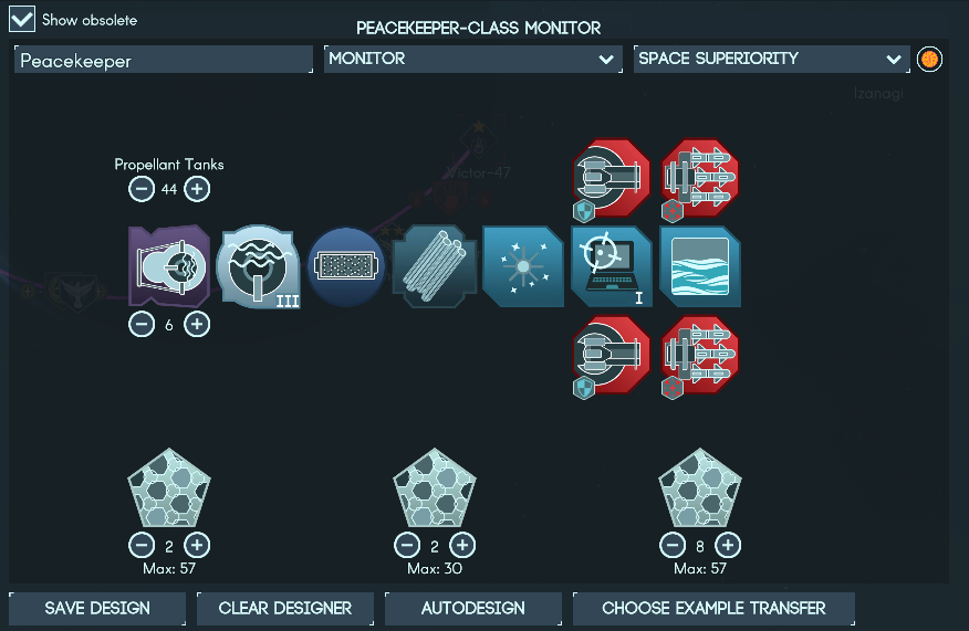 具体来说,造五六个导弹监视器,再配两三台搭载电磁炮的驱逐舰。异形虽然没法秒杀你——Nanotube Armor和点防系统足以让你硬扛伤害,等它们弹药耗尽——但问题在于,那些异形可能在被集火前就溜之大吉,所以才需要组建大规模舰队并发射海量导弹。