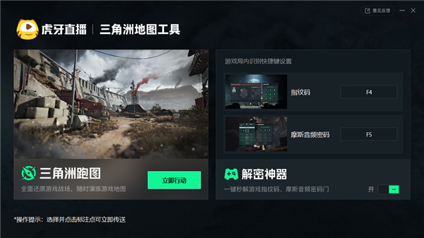 1、目前工具是内嵌在虎牙直播中,玩家下载安装好会自动打开地图工具,后面需要使用点击桌面的虎牙直播点击三角洲地图即可;