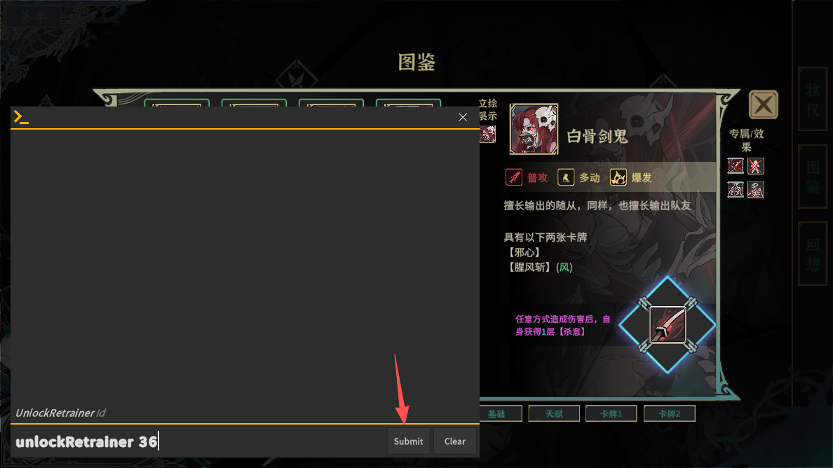 4、点击“~”键,打开控制台,随后复制“unlockRetrainer 36”,随后点击“submit”。