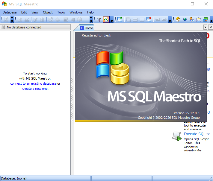 这是MS SQL Maestro第一次运行时的外观。 创建新数据库和连接到数据库链接允许您开始使用新的和现有的数据库。