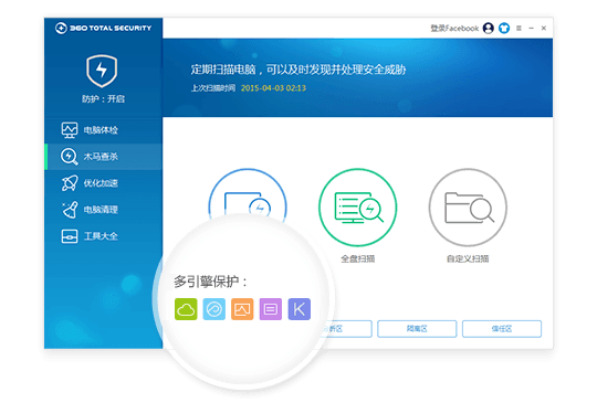 内置国际获奖超强引擎:360云查杀引擎、360 QVMII人工智能引擎、小红伞Avira和Bitdefender扫描引擎,为您提供最完整的病毒检测和防护能力。