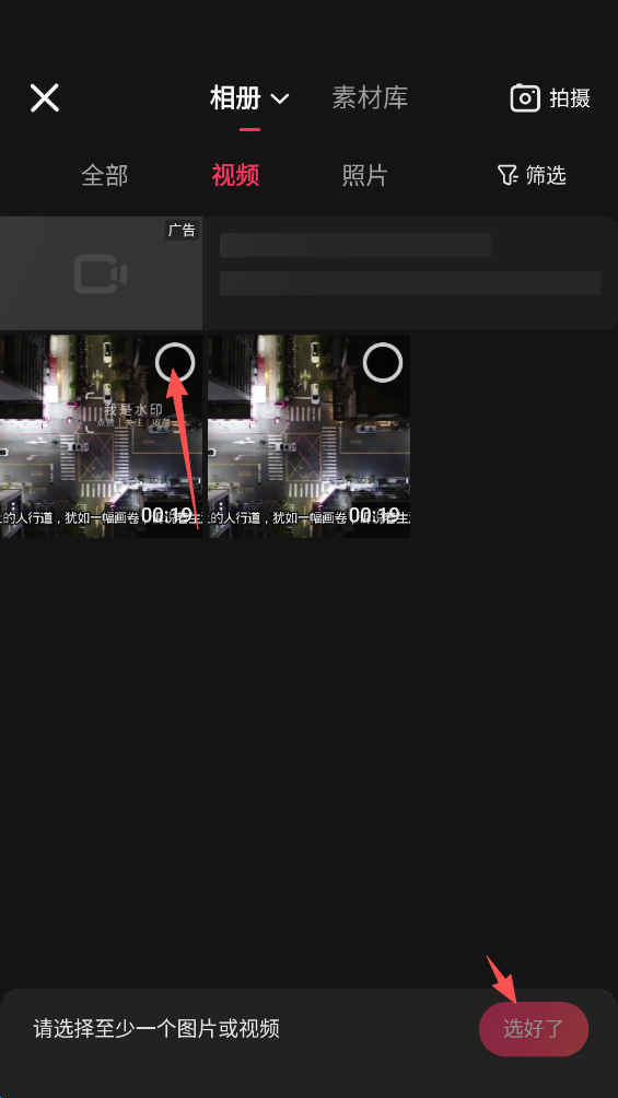 2、选择需要添加字幕的视频,随后点击屏幕右下方的“选好了”。