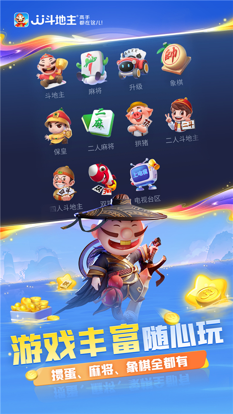1、够全面!经典斗地主、欢乐斗地主、癞子斗地主、四人斗地主;麻将、象棋、升级等应有尽有。