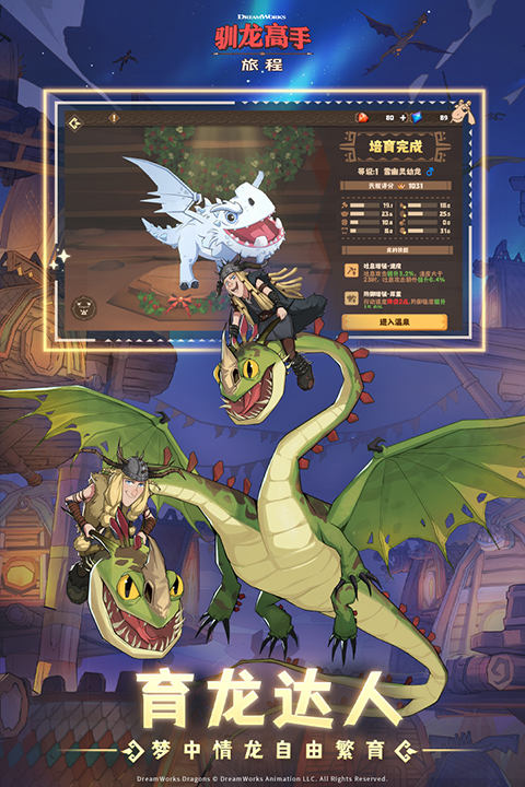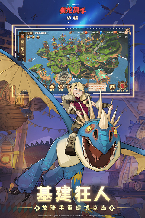 驯龙高手旅程官方正版是一款模拟经营建造养成手游。游戏以热门电影《驯龙高手》为蓝本,将动画内剧故事、人物场景、地图等一一还原,打造了一个全新的驯龙世界。玩家进入游戏后将扮演一名龙骑手,通过不断招募、驯服不同的飞龙,将他们培养提升,升级进阶,组建出强力的飞龙队伍,击败邪恶敌人,保护博客岛的安全。