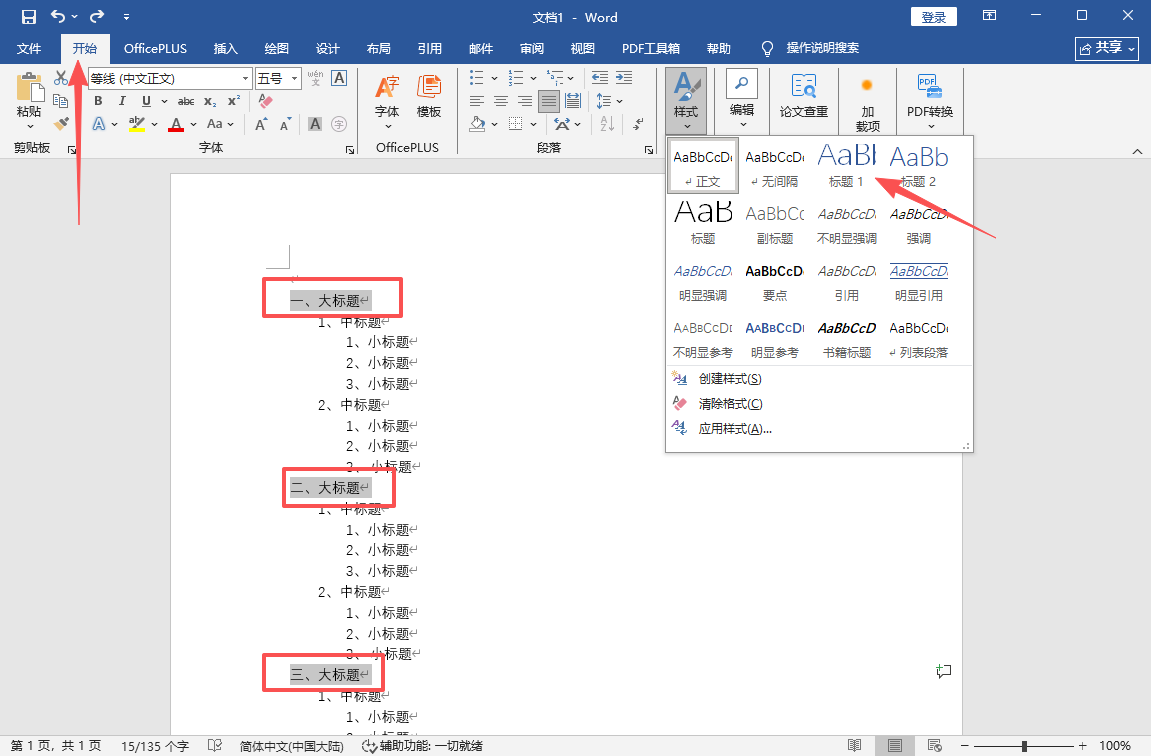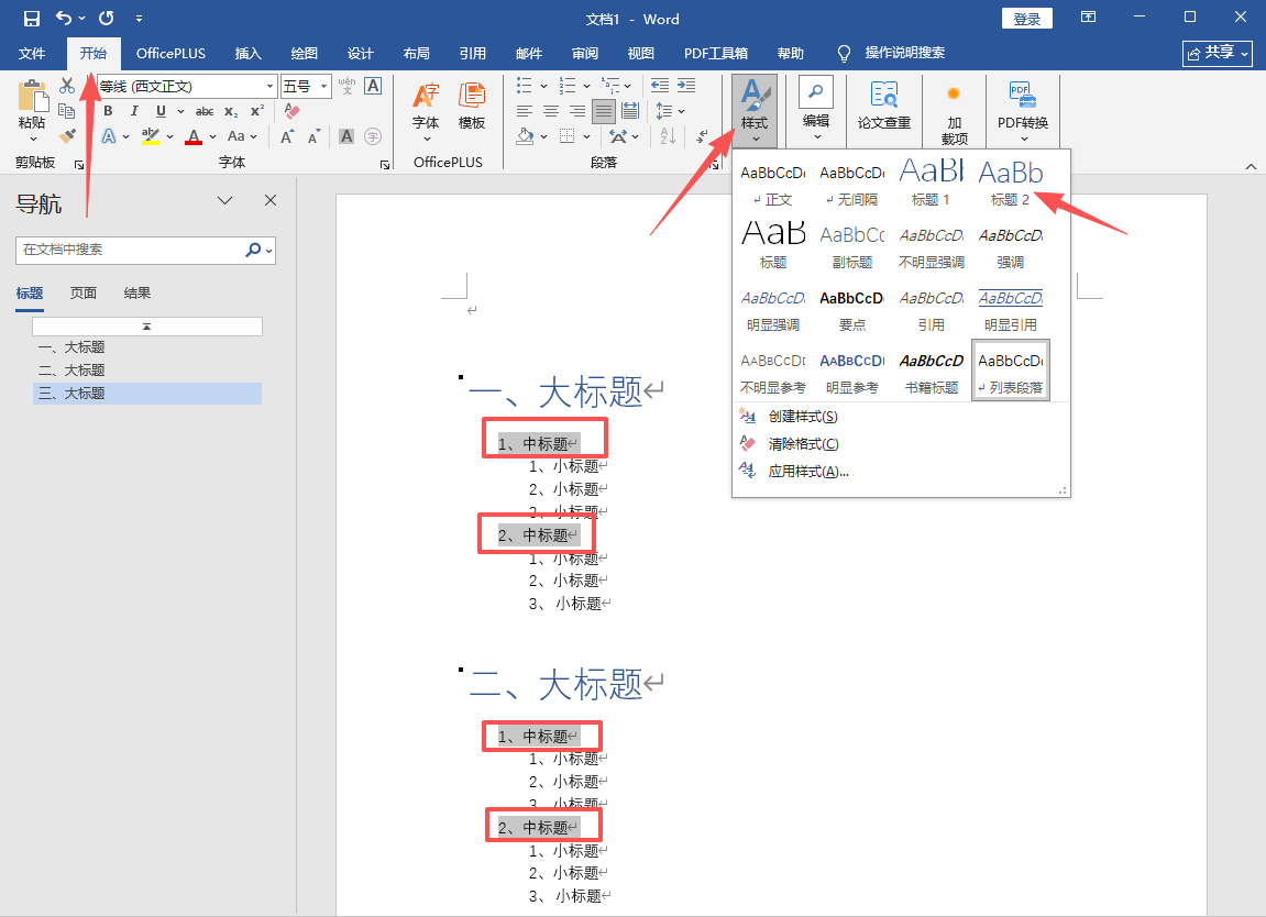 1、首先选中首要标题,点击屏幕左上角的“开始”,再点击“样式”,选择“标题1”。