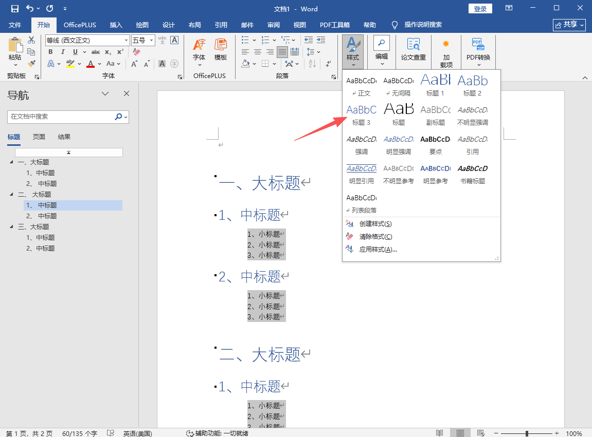 3、再就是选中最小的标题,点击“标题3”。