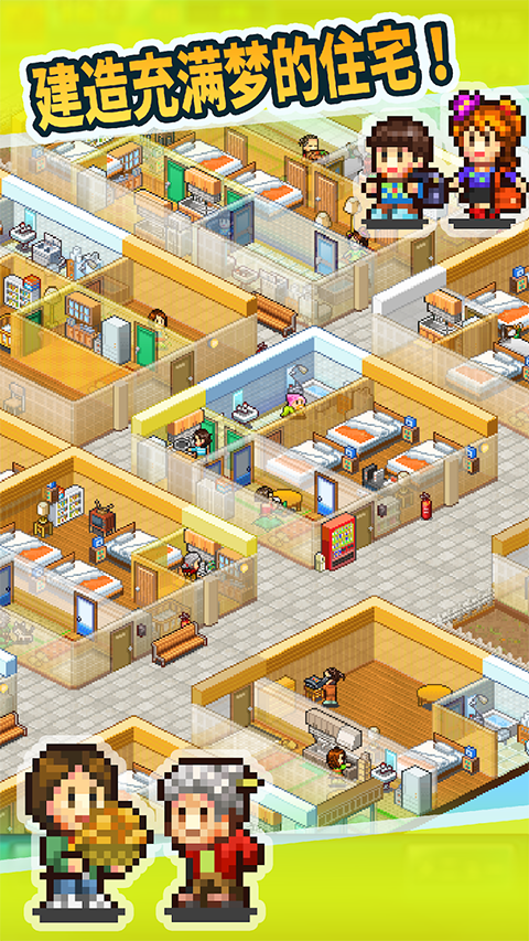 幸福公寓物语是一款经典的像素画面风格的经营养成游戏,游戏画面简单,开罗游戏经典模拟玩法,趣味管理自己的公寓。游戏中玩家需要先申请一间新的公寓才能开始布局,自定义编辑,修改建筑物名称,地图、居民,弄好之后点击开始游戏。对于新手玩家来说,这里有众多房间,包括游戏间、学习间、和风、西洋风等,更有丰富的专门房间,来帮助房间和居民的升级,根据住户的收入情况控制好家具维护费之后,租金与维护费之间的差距越大,随着住客收入提升你的租金纯收益也就越高。