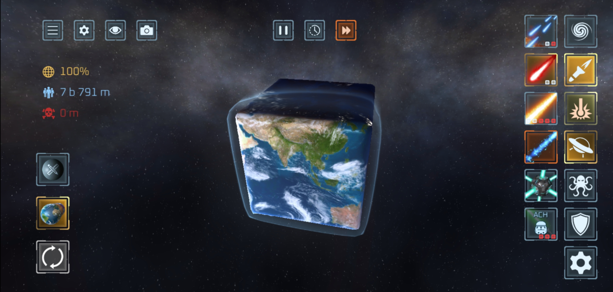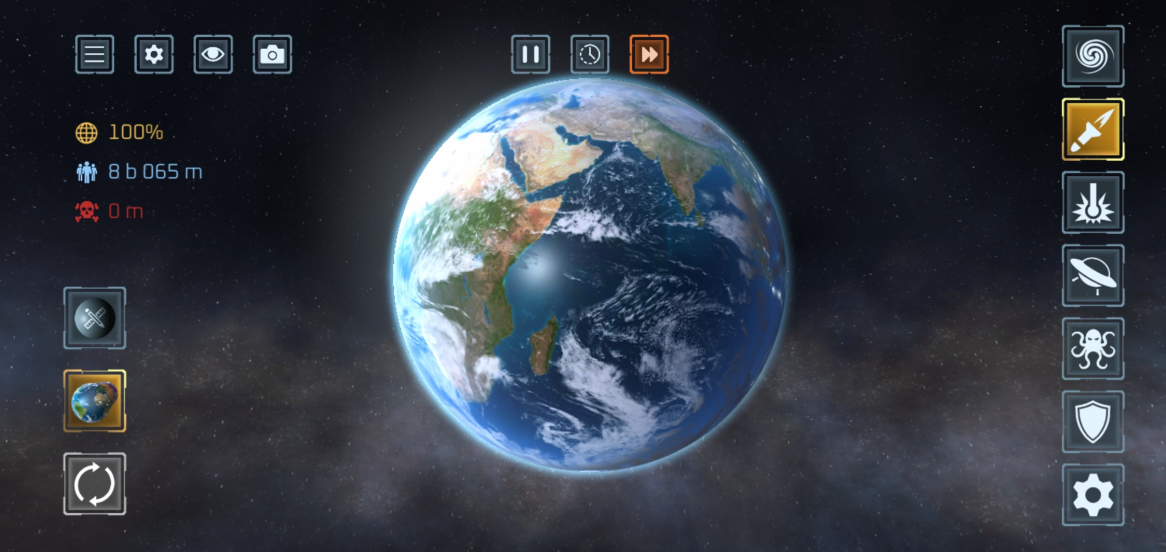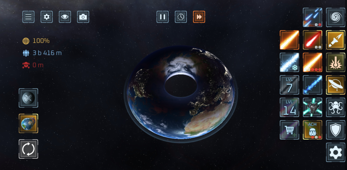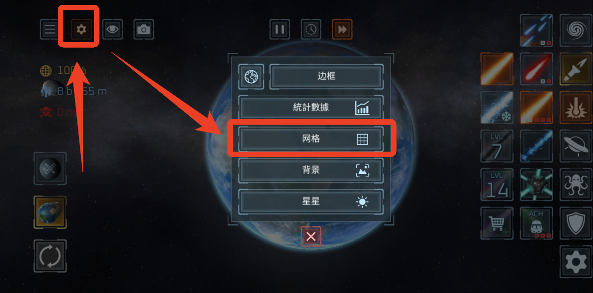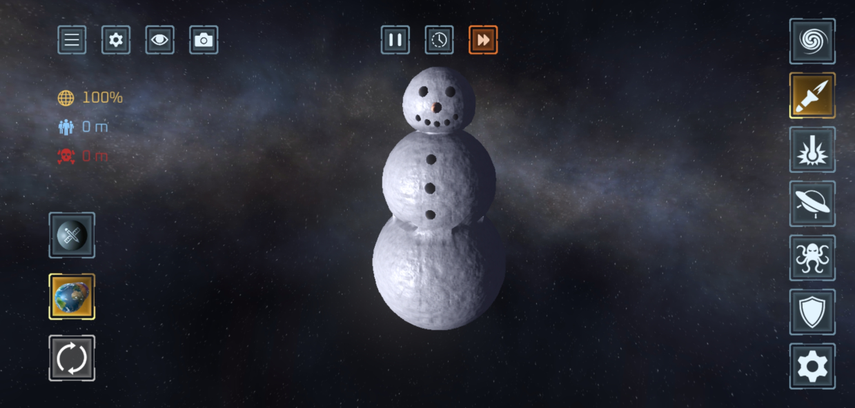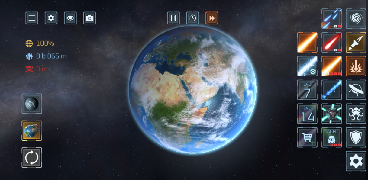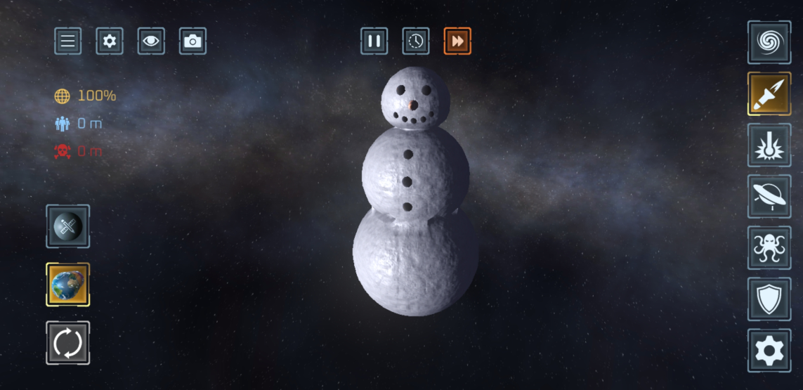 使用 50 多种武器 摧毁行星与卫星!激光、陨石、核弹、反物质导弹、UFO、战舰、太空战机、电磁轨道炮、黑洞、太空柴犬、轨道离子炮、超新星、光剑、巨型怪兽、天体生命,甚至还有护盾与防御卫星等防御武器。