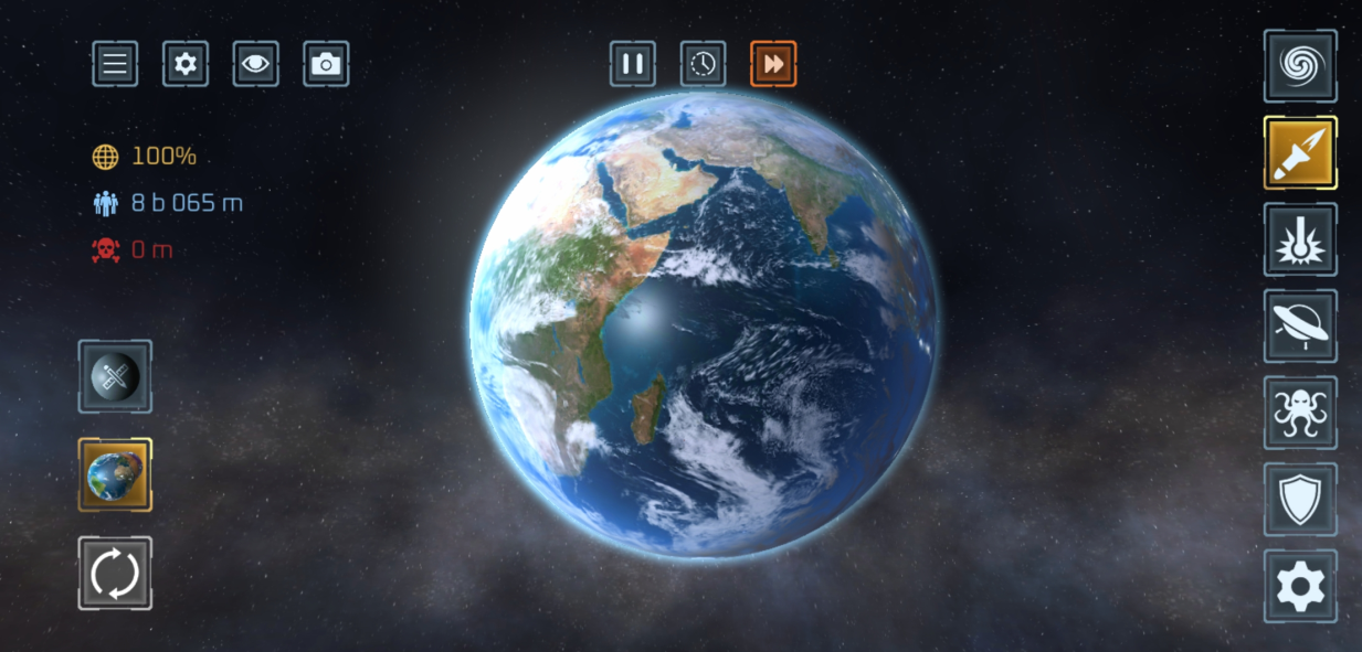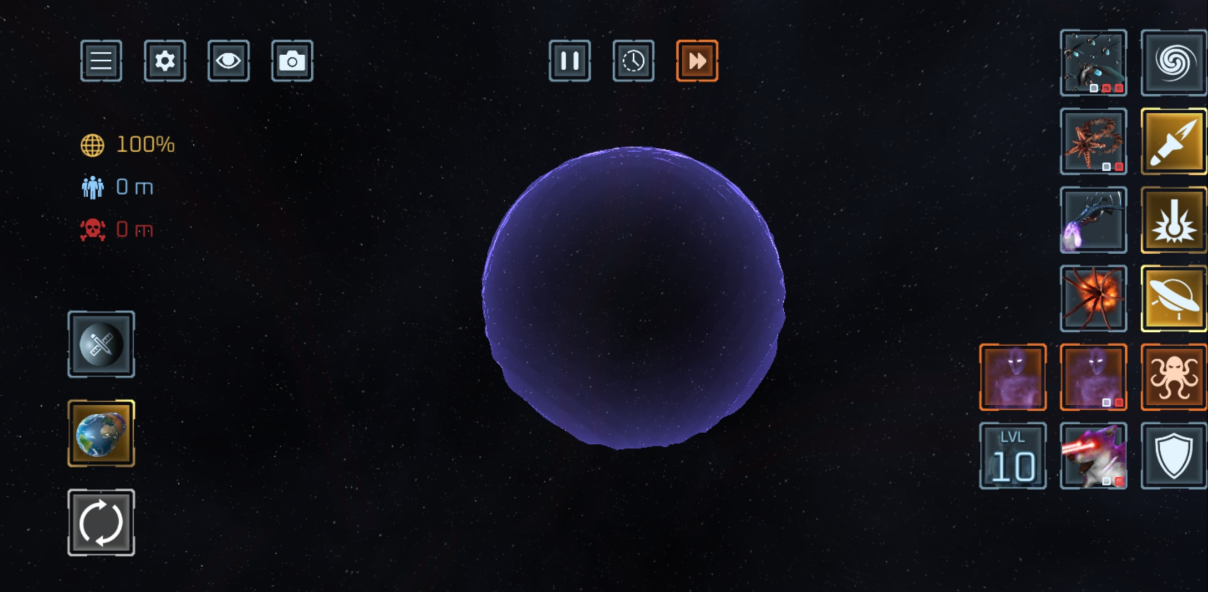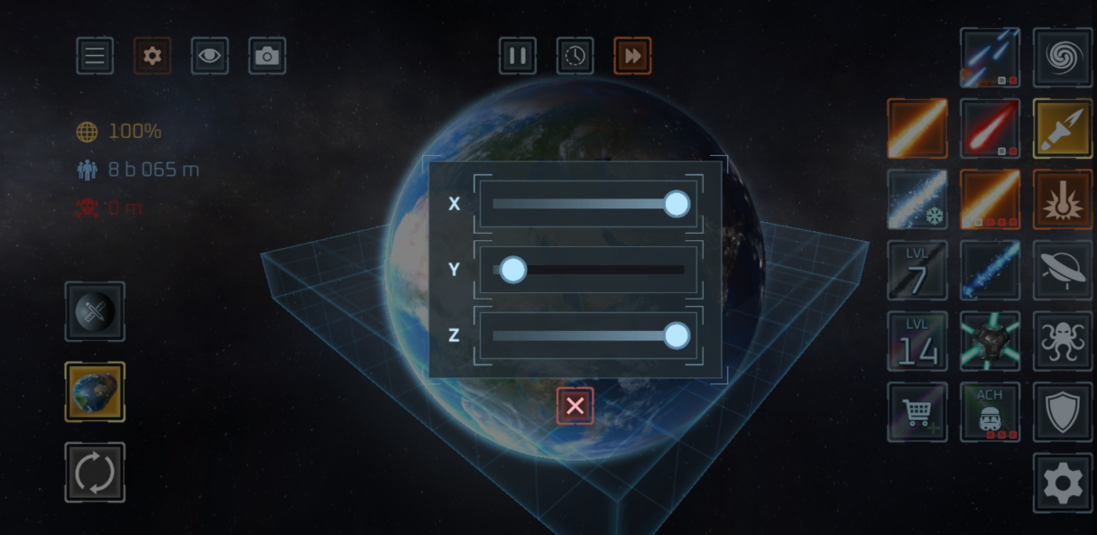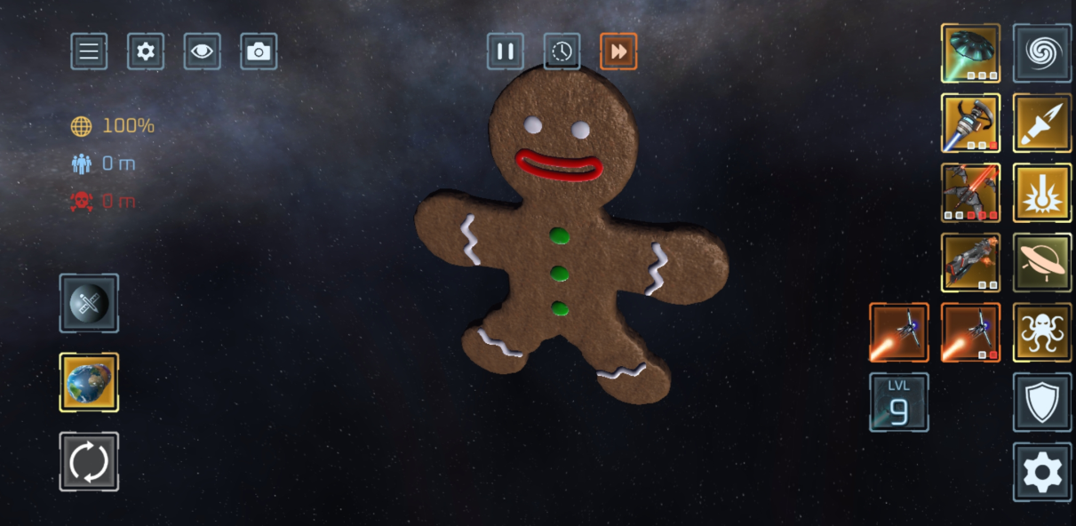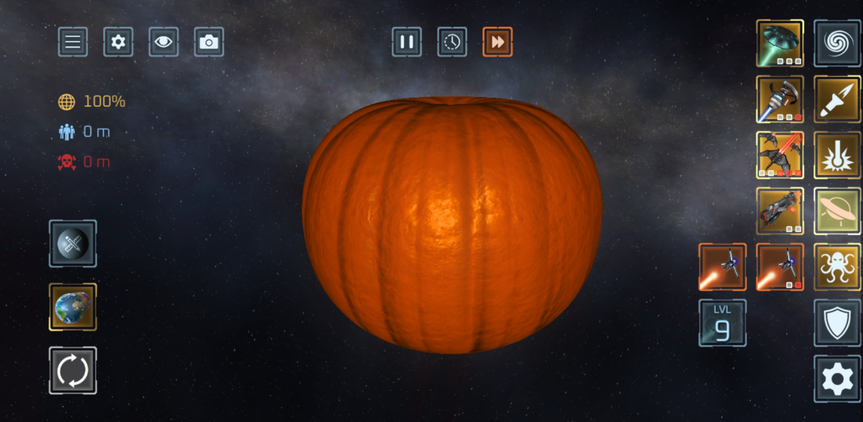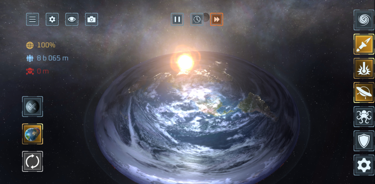 使用 50 多种武器 摧毁行星与卫星!激光、陨石、核弹、反物质导弹、UFO、战舰、太空战机、电磁轨道炮、黑洞、太空柴犬、轨道离子炮、超新星、光剑、巨型怪兽、天体生命,甚至还有护盾与防御卫星等防御武器。