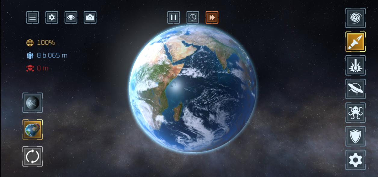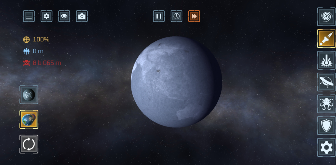 游戏中以地球为例,如果选的星球有人,会发现右边的人数死亡占比,如果摧毁海面,人死的很少,如果摧毁陆地,人的死亡数便很多,并且人只在表面,如果把星球打穿了,都有可能还有人存在,可以从视觉上体验当一颗星球被毁灭时的样子。