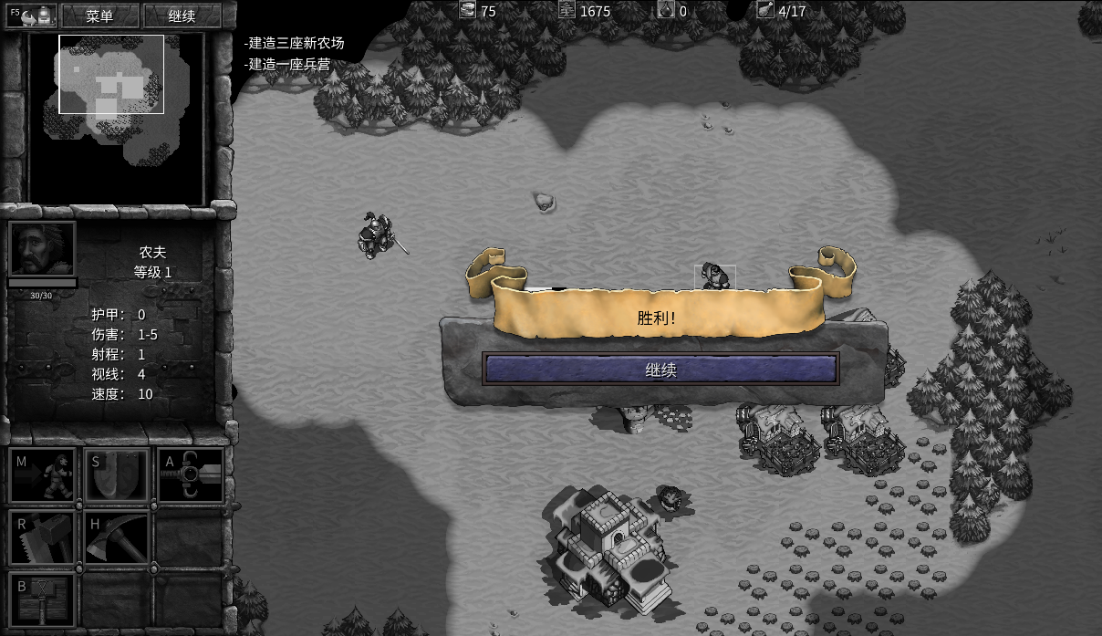 6、当物资收集完毕后,就可以开始建设农场以及兵营了,农场可以增加人口上限,兵营则可以招募士兵。