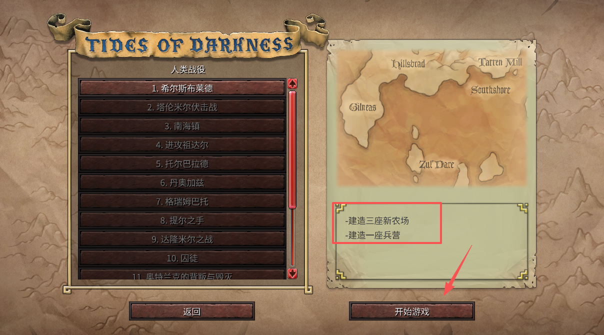 2、选择战役关卡,注意每关的任务要求,有的是发展任务,还有的则是护送或者歼灭等任务。点击“开始游戏”。