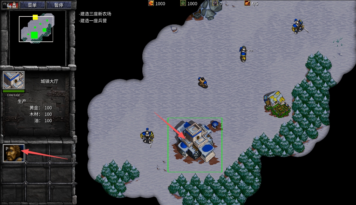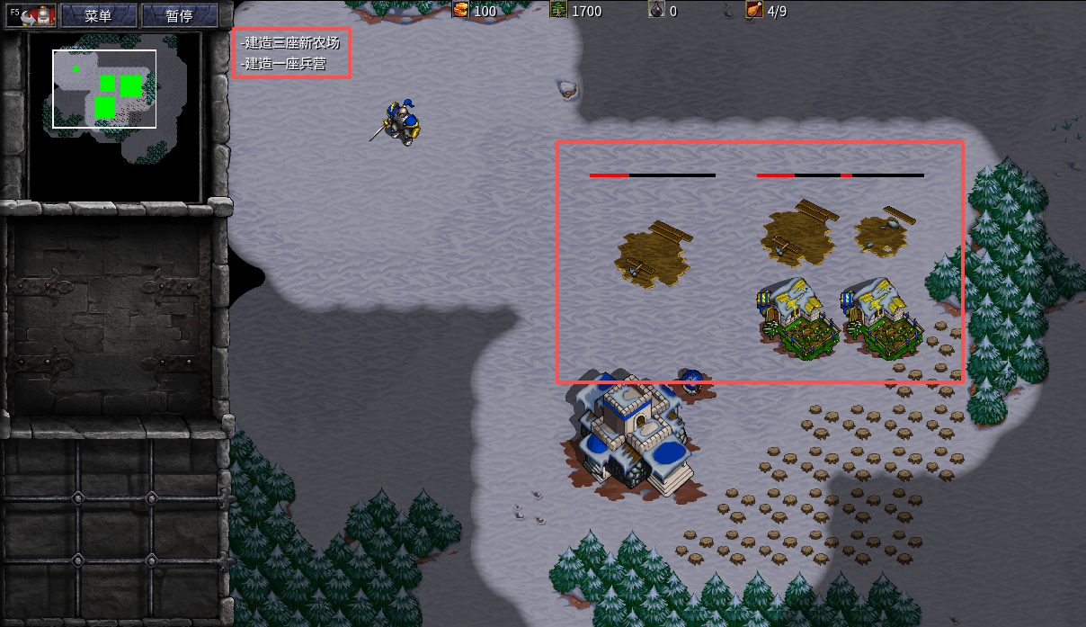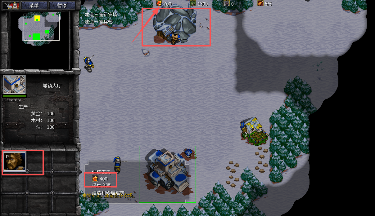 4、农场和兵营的修建都需要金币和木材,玩家可以命令农夫砍斧树木以及挖矿。