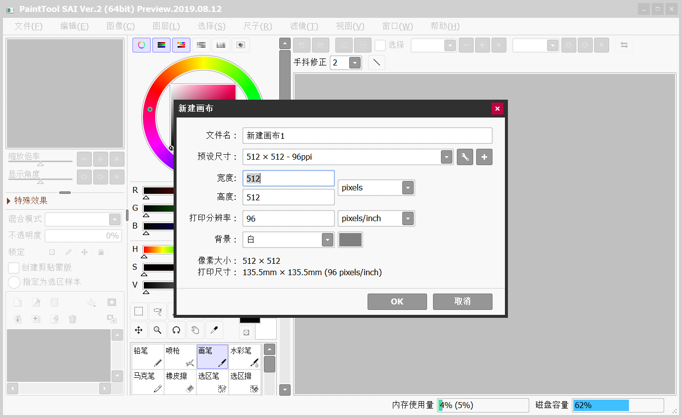1、打开电脑上已经装好的SAI软件,并使用快捷键“Ctrl+N”键(新建画布)。