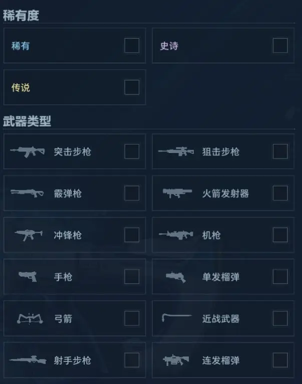 按照枪械种类,武器分突击步枪、狙击步枪、霰弹枪、火箭发射器、冲锋枪、机枪、手枪、单发榴弹、激光武器、弓箭、近战武器、射手步枪、喷射器、连发榴弹,共计12种武器类型,以应对不同情况。