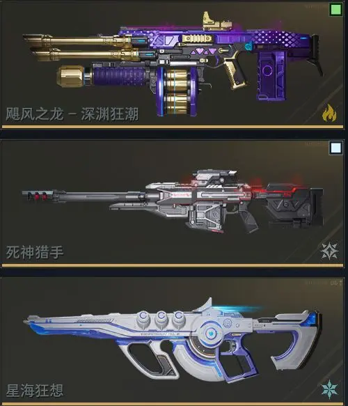 如猎场经常使用的飓风之龙是传说霰弹枪,单发6弹,适合清理一群小怪;死神猎手是传说射手步枪,单发伤害高,且有高倍镜与穿透效果,适合打BOSS;星海狂想是传说突击步枪,射速较为突出,更适合PVP模式使用。