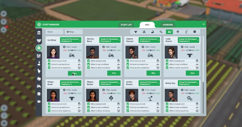 雇用熟练工,根据他们的技能分配适当的任务。购买必要的机器,监测其技术状况和燃料利用率,确保在作物收获期的可用性。