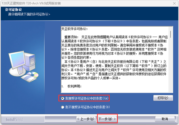 1、解压压缩包双击“T20天正建筑软件V9.0.exe”,勾选“我接受许可证协议中的条款”点击“下一步”;