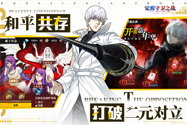 觉醒守卫之战是基于东京食尸鬼改编而来的一款高燃3D战斗喰种题材手游,玩家将化身喰种或搜查官,集结雾岛董香、铃屋什造、古间圆儿等经典伙伴,组建专属战斗小队,穿梭于霓虹闪烁的都市街巷进行战斗,在喰种与人类的阵营博弈中,探寻世界的真相,书写属于你的生存之战!游戏玩法采用放置回合制模式,根据不同的角色属性灵活搭配多种体系,进入章节即可自动战斗获取奖励、装备,通过穿戴装备、升级、升星、镶嵌宝石等途径来提升角色战斗力,还可以赠送礼物给角色,购买不同属性服装进行搭配。