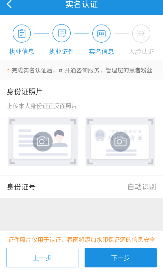 5、接下来就是上传本人的身份证正反面照片以及身份证号,点击下一步进行人脸认证就完成了注册的步骤。完成实名认证后才能开通咨询服务。