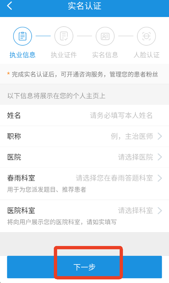 3、之后就是填写你的姓名、职称、医院、科室,填写完毕点击【下一步】。