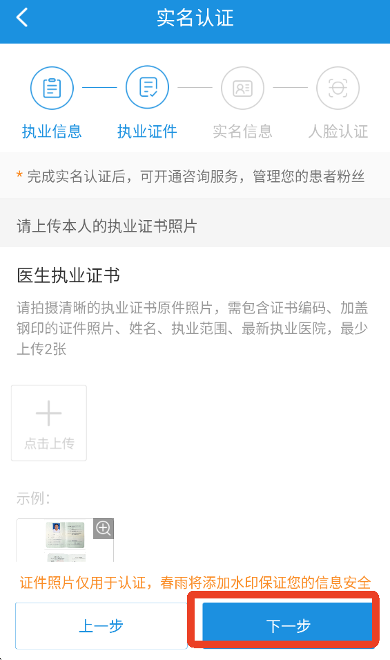 4、上传i的医生执业证书和职称证书,注意上传照片的要求,然后点击下一步。