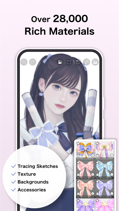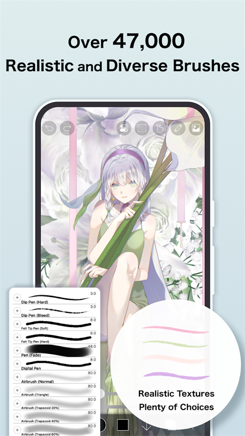 - G笔,笔,数码笔,气刷,圆刷,平刷,铅笔,油画颜料,木炭,蜡笔,邮票等超过47,000种画笔图案