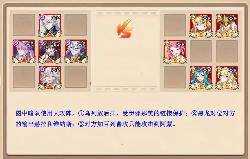 此阵型对有伊邪那美的暗队比较契合。伊邪那美的技能是链接后排英雄,当后排有多名英雄时,链接就变得随机了。而单后排阵型就能使她的技能达到指定链接的目的。