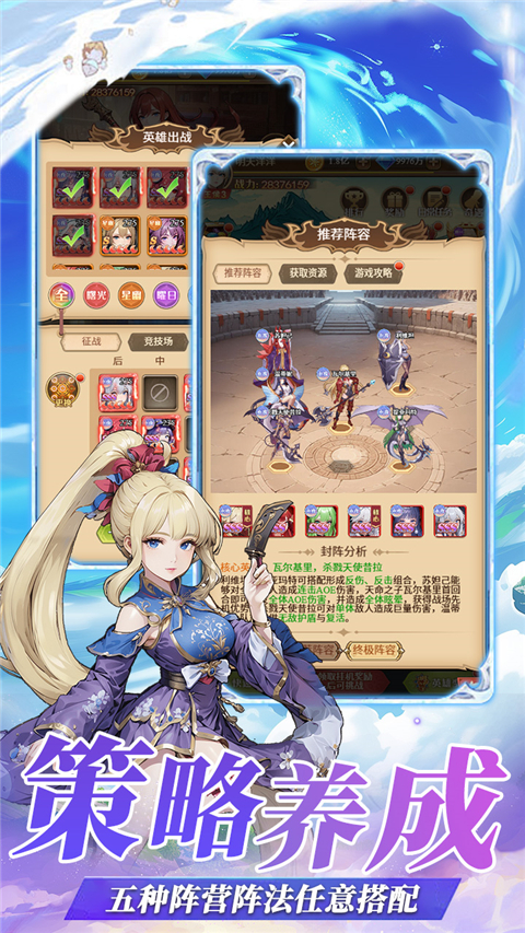 5、策略养成,五种阵营阵法任意搭配。